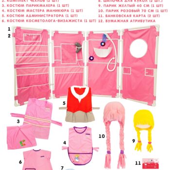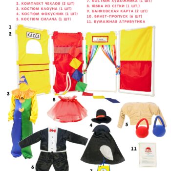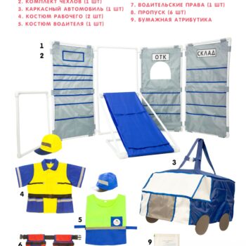 Костюмы: — рабочий (2 шт.); — водитель (1 шт.); — пояс монтажника (2 шт.). Оборудование: — ширма из труб диаметром 20 мм из 4-х секций с дополнительными секциями (1 шт.); — комплект чехлов «Завод» (1 шт.); — каркасный автомобиль синий (1 шт.). Игровая атрибутика: — водительские права (1 шт.); — пропуск (6 шт.). Бумажная атрибутика: — заказ-наряд на изделие; — накладная на отгрузку товара; — надпись «Завод». Материал: костюмы, чехлы для ширмы,чехол на каркасный автомобиль – ткань оксфорд (100% полиэстер); каркас для машины, ширма – 100% полипропилен. Стоимость уточняйте у менеджера! Оставьте заявку и мы с Вами свяжемся!