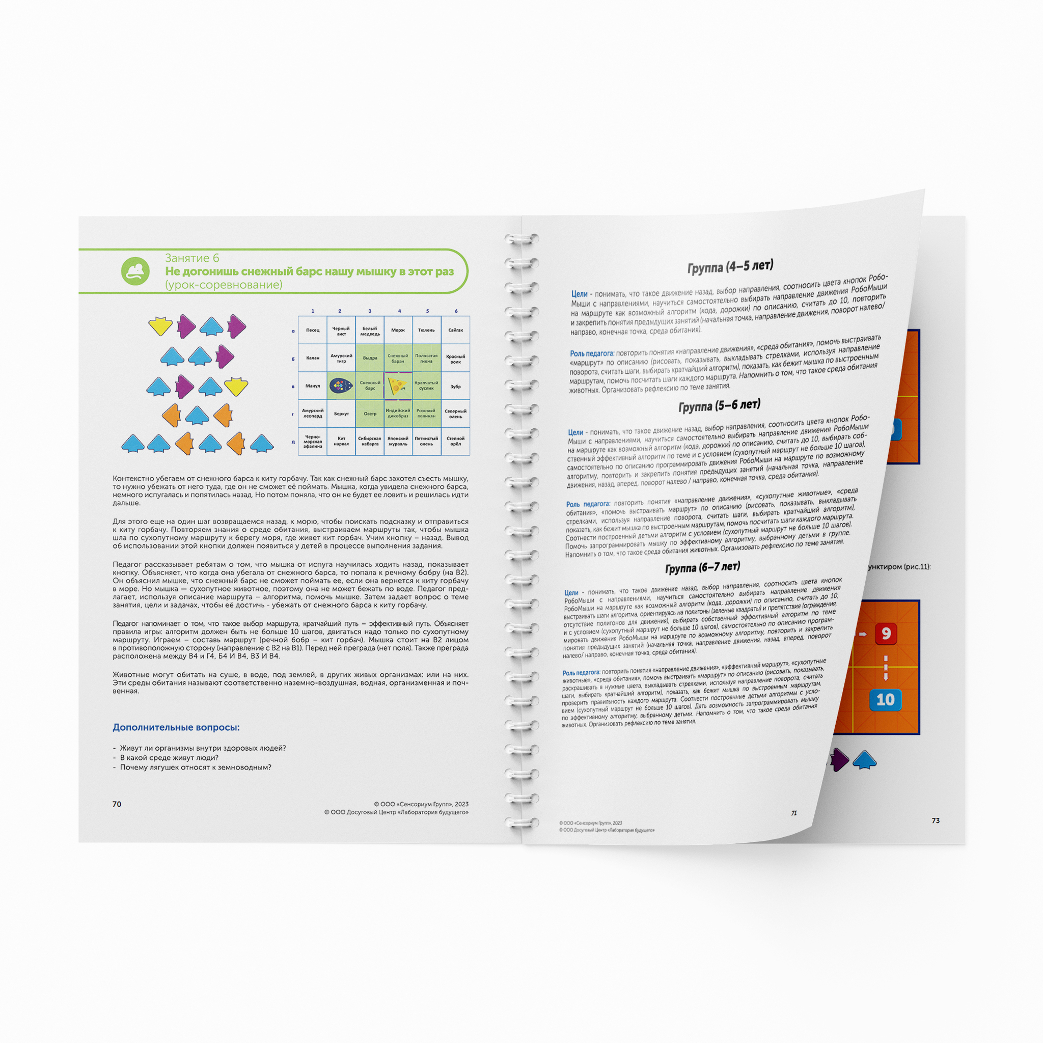 120 страниц методических рекомендаций позволяют педагогу организовать эффективную обучающую среду. Дети осваивают навыки программирования и кодирования с роботом РобоМышь при параллельном интерактивном изучении окружающего мира: диких и домашних животных, профессий, природных и архитектурных достопримечательностей России и т. д.